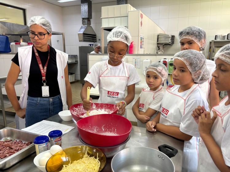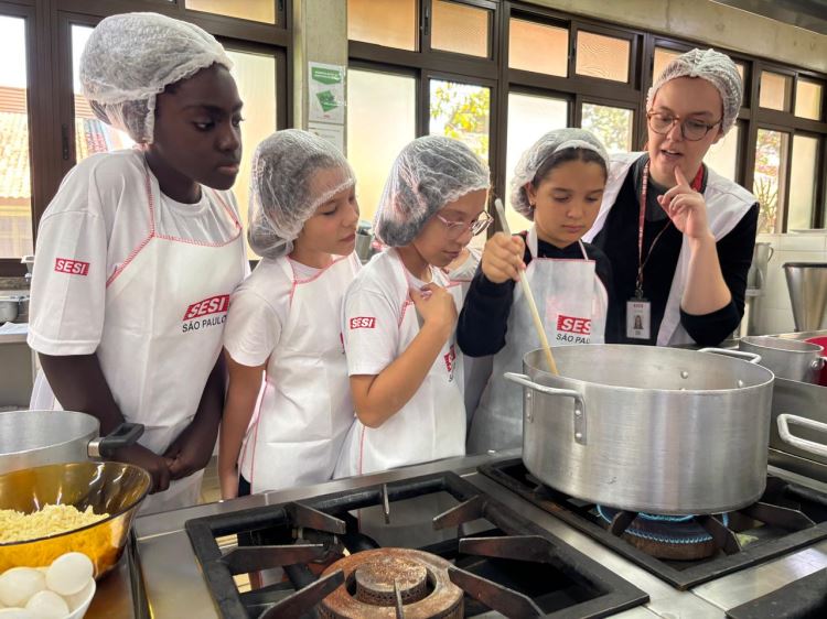 A etapa prática aconteceu com o apoio da nutricionista da escola Sesi Jacareí, Vitória Maciel, e da equipe da cozinha escolar, que acompanharam os alunos durante a preparação das receitas. O momento foi marcado pela integração entre teoria e prática, além do cuidado com aspectos como higiene, organização e segurança alimentar.